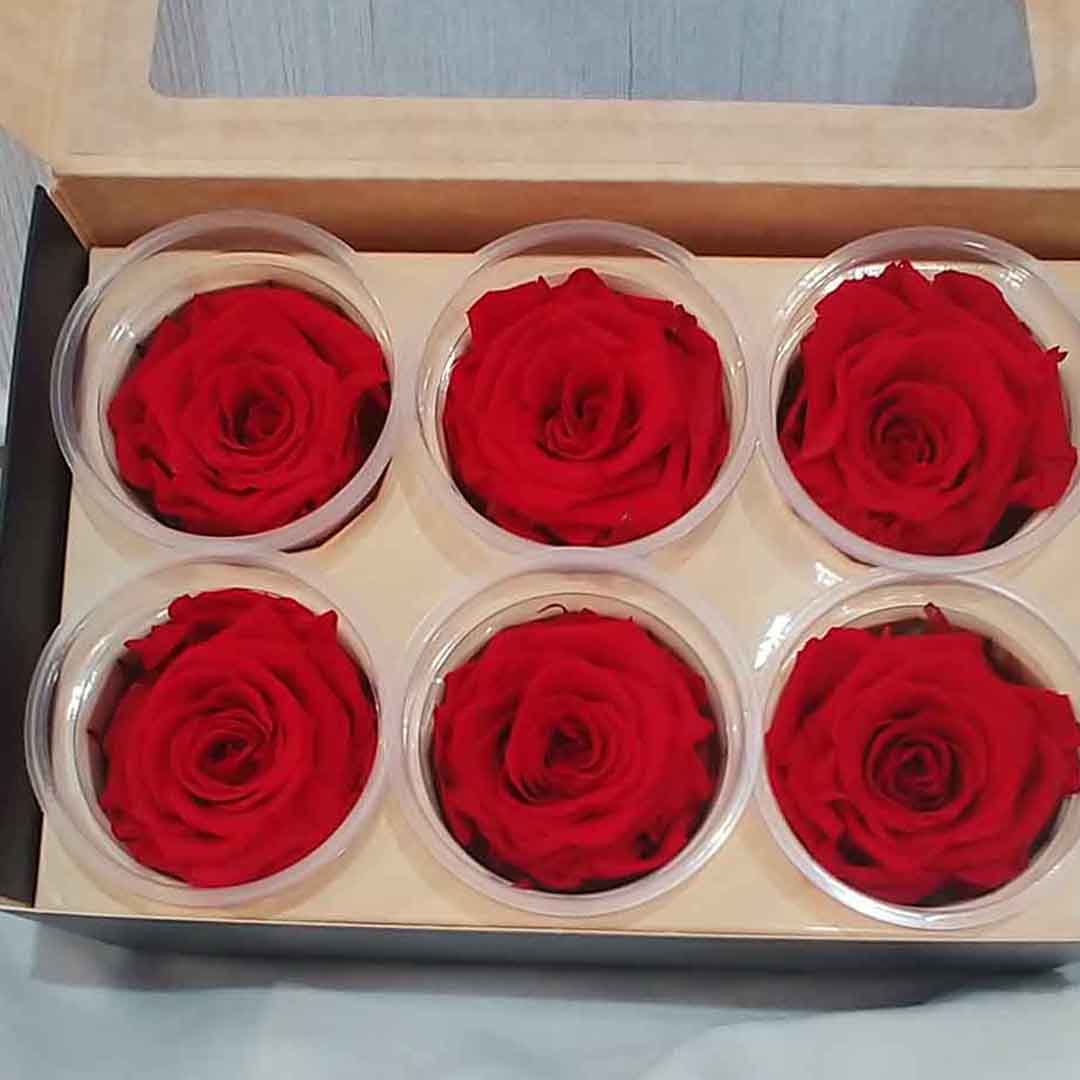 Caja de 6 Rosas Rojas Preservadas.