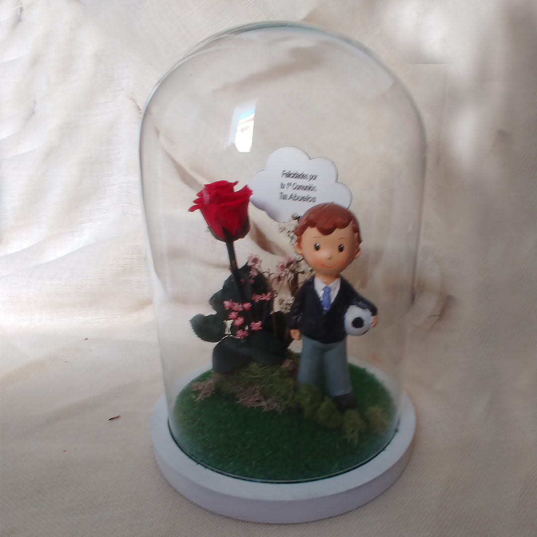 Cúpula de Cristal con figura de Niño de Comunión, plaquita y Rosa Eterna Preservada