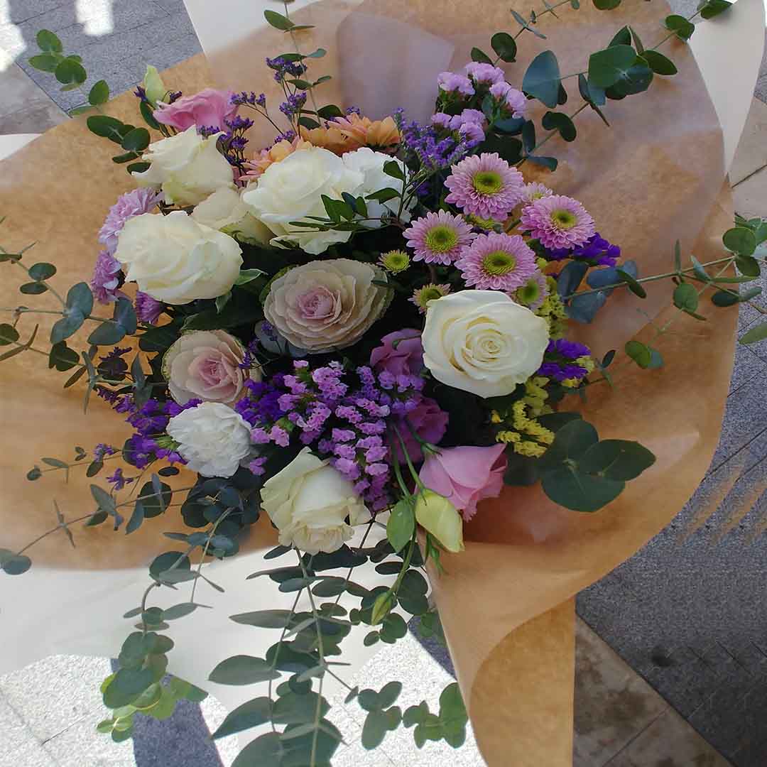 Composición Clavel Blanco, Eucalipto Natural, Lisianthus Rosa, Margarita Euro Malva, Rosa Blanca, Statice Morado