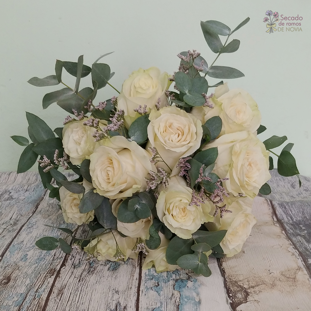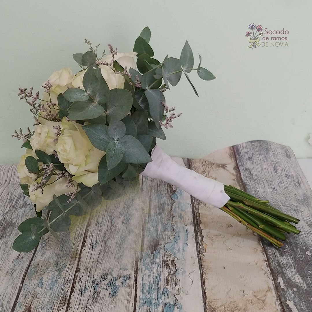 Flores: Rosas blancas naturales y eucalipto.